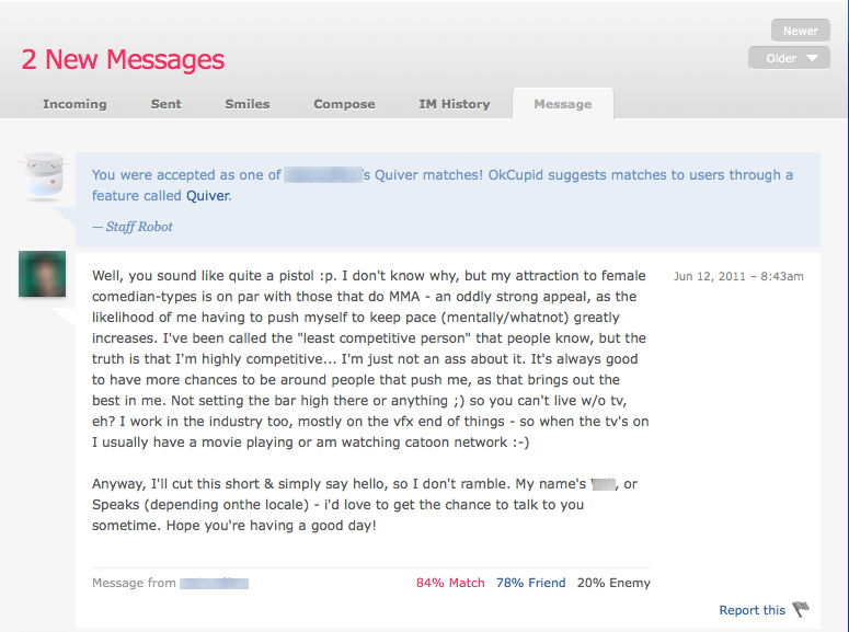 Names and pictures have been hidden to protect the “innocent.” Nicknames have not. When a guy sends you this long of a message that really isn’t that interesting AND then also tells you that his nickname is “Speaks,” it really does tell you a lot…a lot more than what he blabbed on about.