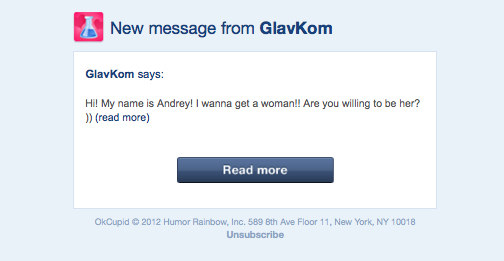 But MOST IMPORTANTLY, Andrey, no, I am NOT willing to, as you say, “be” your woman. The creepiness factor alone of writing to a girl you don’t know and saying “I want to get a woman,” is high enough…don’t make it worse by asking me to be her…Because honestly, in my mind I am just envisioning Screech from Saved By the Bell (and we all know how that turned out…Porn, in case you didn’t know…)