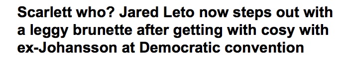 But Scarlett’s week isn’t just sucking because her ex husband has moved on! No, apparently last week Scarho “reunited” with her ex BOYFRIEND, Jordan CatalonoJared Leto at the DNC: