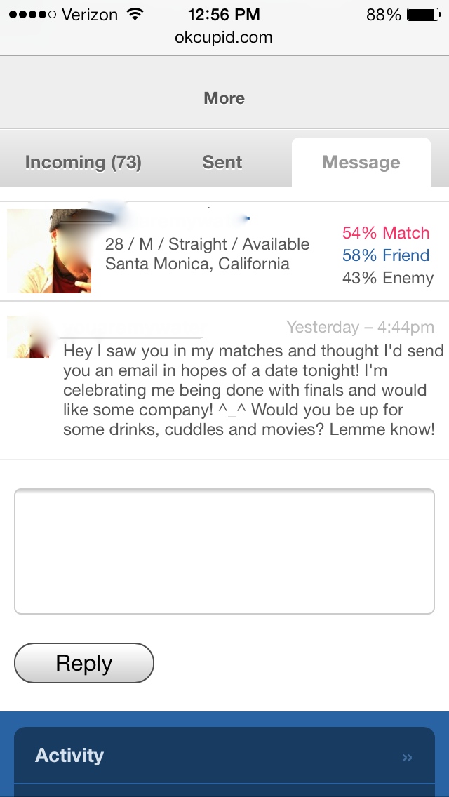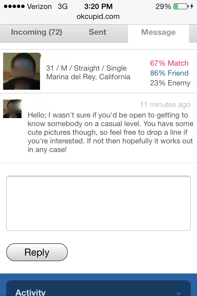 Um….ok. That is a pretty oddly phrased invite for what I’m guessing is some casual sex. But glad you think my 3 year old photos from my okcupid profile I haven’t touched in 3 years are cute “though.” Hmmm…ok.
